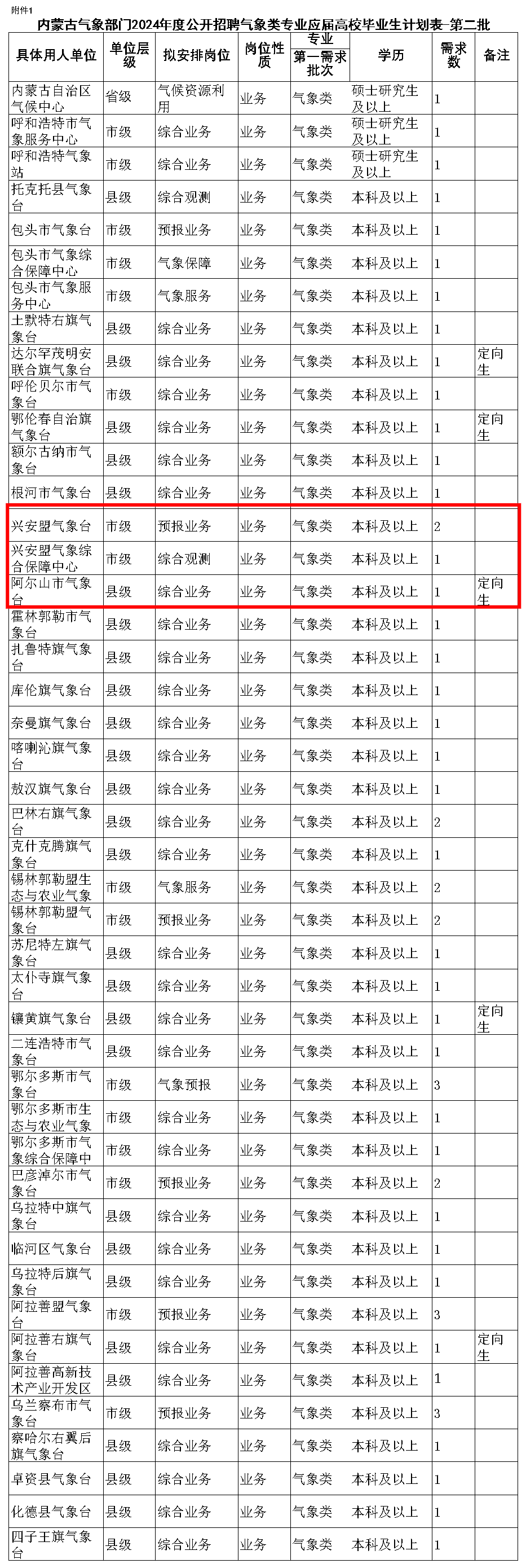 1.内蒙古气象部门2024年度公开招聘气象类专业应届高校毕业生计划表-第二批.xlsx