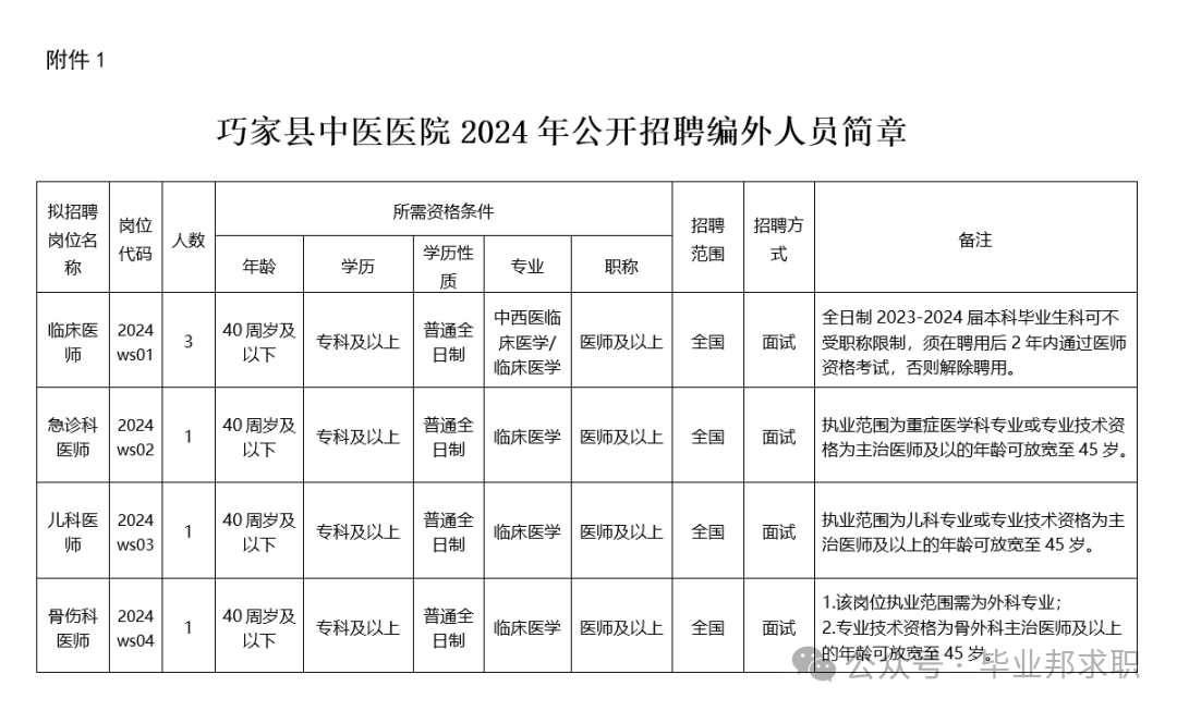 (一)岗位设置:详见附件《巧家县中医医院2024年公开招聘编外人员简章》。