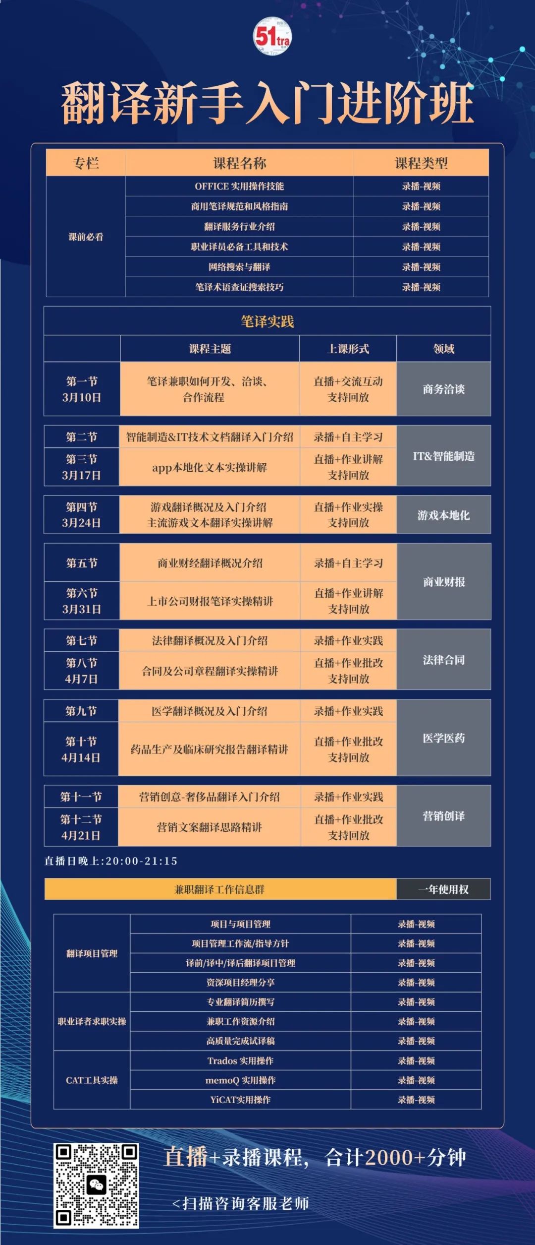 翻译实践部分--有7次直播课+5次录播,每次75分钟,6次作业1对1批改;