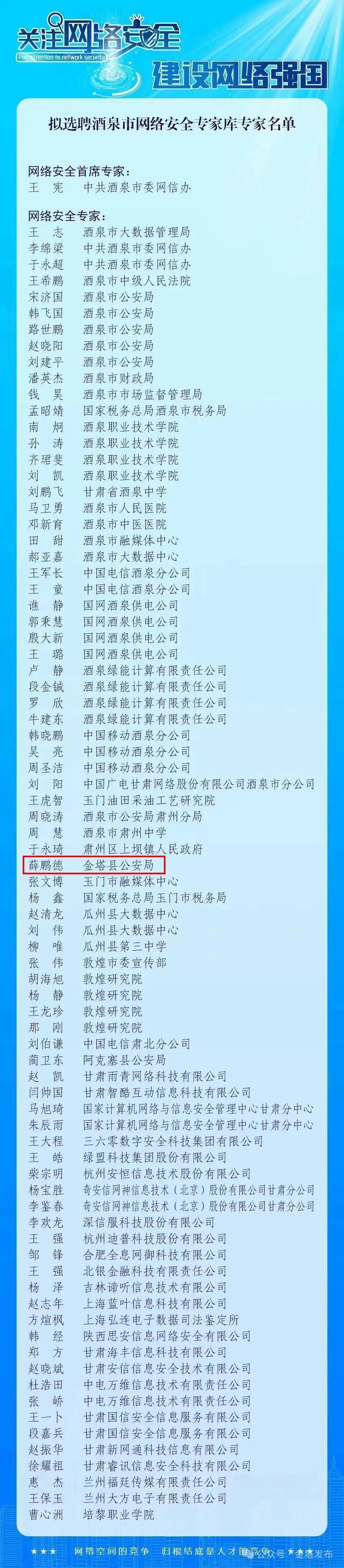 经个人申报、单位推荐,共有市内外320名专业人员积极申报。按照《酒泉市网络安全专家库管理办法(试行)》《酒泉市网络安全专家库专家评审方案》等规定,我办对报名人员资质条件进行逐一审核,并成立酒泉市网络安全专家库专家评审委员会,组织召开评审会议。经评审,拟选聘王宪为酒泉市网络安全专家库首席专家,选聘王志等80人为酒泉市网络安全专家库专家。