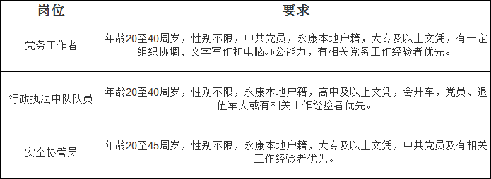 党务工作者1名、行政执法中队队员1名、安全协管员1名。