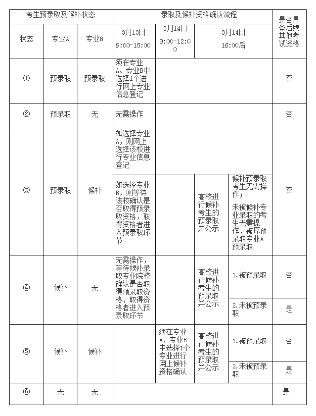 候补录取转预录取:所有学生确认完志愿后,也就是第二天傍晚左右,学校会在招生网公布由“候补录取”转为“预录取”的学生名单。