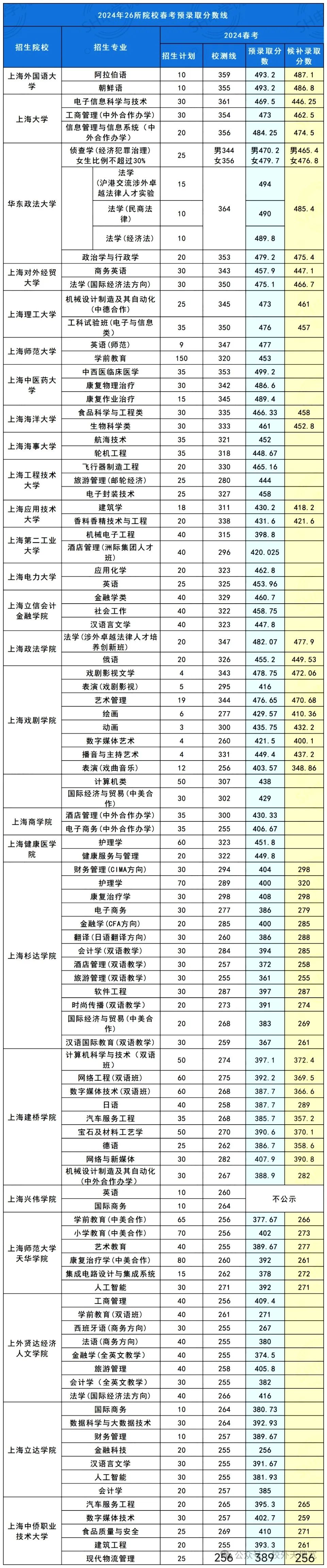 2024年上海春考各高校预录取分数线及预录取候补录取名单已经在官网公布!分数线&名单汇总如下: