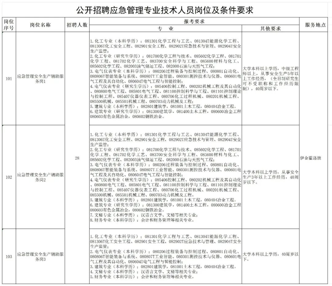 根据业务开展需要,按照政府购买服务项目相关要求,鄂尔多斯市人才发展集团有限公司面向社会公开招聘应急管理安全生产辅助服务专业技术人员28人,现将有关事项公告如下: