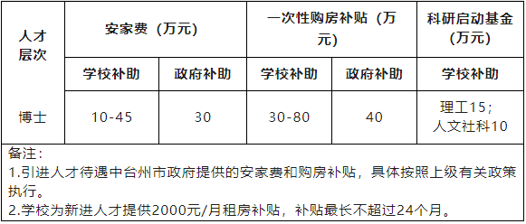 聘用人员除按国家有关规定享受工资、保险等待遇外,符合《台州开放大学人才引进办法》高层次人才标准的提供购房补贴、安家费、科研启动费等方面的待遇。详见下表: