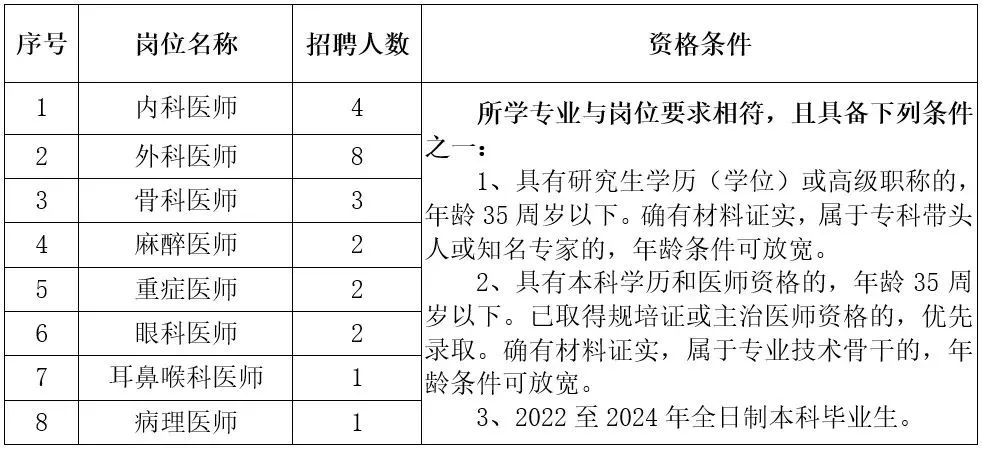 备注:符合招聘条件的人才,医院为其提供专业发展的平台,提供进修学习的机会,提供免费学习和住宿的条件,享受在编人员同等的薪酬待遇;属于医院重点紧缺专业的研究生学历(学位)人才,医院对其重点培养和使用,优先提供发展平台和各类资源,给予10万元安家费,享受政府高层次人才引进的各项政策待遇;属于某专业领域专科带头人或知名专家的,采用一人一事一议的方法确定其薪酬待遇。
