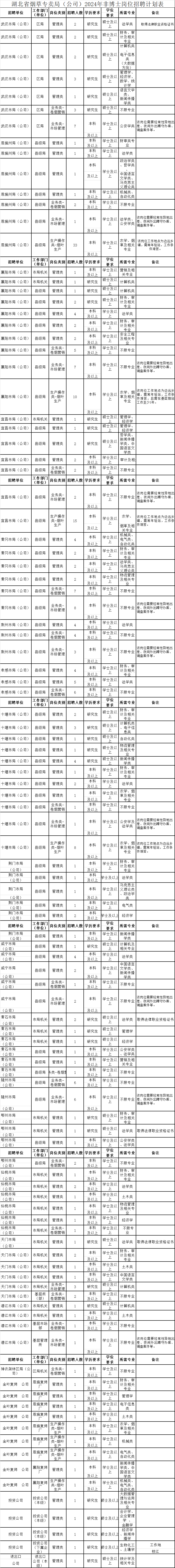 本次公开招聘282人,具体招聘岗位、人数和相关要求见湖北省烟草专卖局(公司)2024年岗位招聘计划表(见附件1、附件2)。