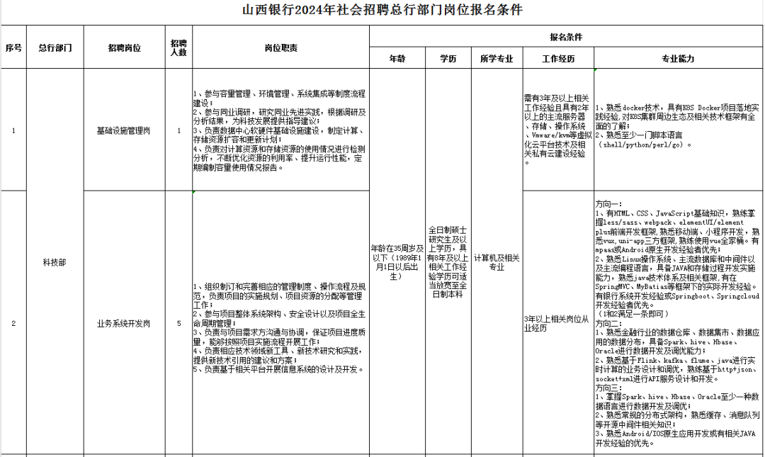 序号 | 总行部门 | 招聘岗位 | 工作地点 | 招聘人数 |