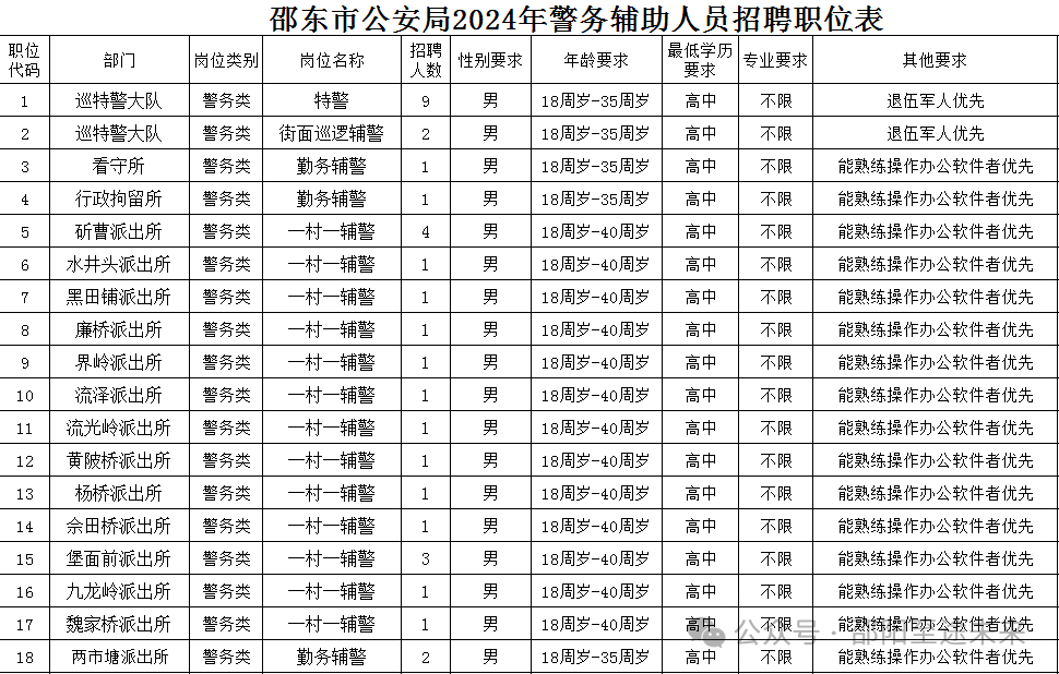 本次计划招聘共33人。具体的招聘职位、人数、资格条件等详见《邵东市公安局2024年警务辅助人员招聘职位表》。