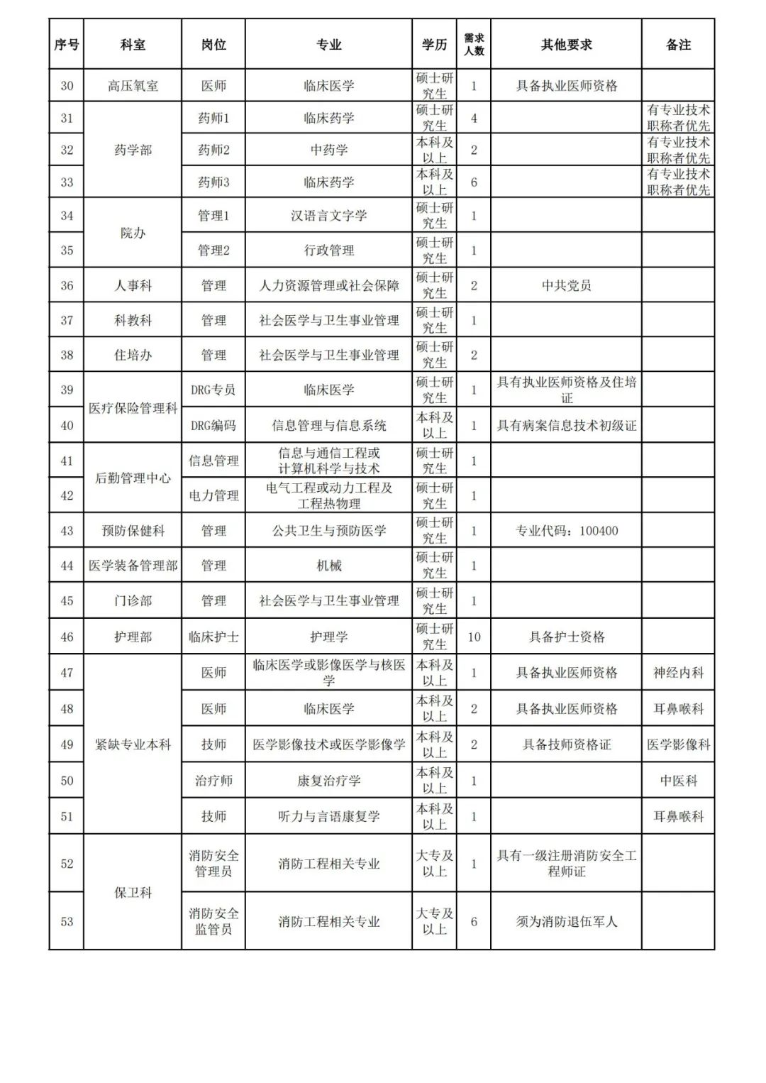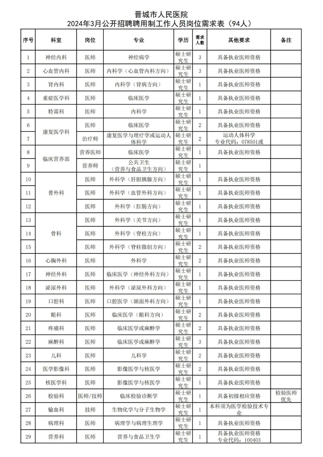 医院设有白水院区和水陆院区,两区优势显著,特色专科鲜明。医院建筑面积达26万平方米,开放床位2111张,共设78个科室,拥有省市级重点学科33个,其中山西省医学重点学科2个、山西省医学重点建设学科1个、省级临床重点专科6个、市医学重点学科24个。医院与中国医学科学院阜外医院携手共建的“晋城市人民医院心血管病优质医疗资源扩容建设项目”于2023年7月31日正式动工。该项目将于2025年6月竣工,届时,一个布局合理、设施先进、技术精湛、服务优质的拥有480张床位的高水平心血管病诊疗中心将投入使用。医院设施先进,设备精良。配备有西门子双源CT、GE256排CT等6台高端CT、飞利浦3.0T、GE3.0T等4台磁共振仪、飞利浦高端血管造影机4台、联影高端PET-CT 1台、西门子SPECT/CT 1台、安科锐高端螺旋断层放射治疗系统(TOMO)1台、瓦里安直线加速器2台、聚焦超声肿瘤治疗系统(海扶刀)1台、超高清奥林巴斯腹腔镜8套、体外膜肺(ECMO)2台、罗氏全自动生化免疫流水线等一系列国内外知名品牌的先进设备。医院教学力量雄厚。作为山西医科大学及长治医学院附属医院、山西中医药大学教学医院、国家首批住院医师规范化培训基地及全科医生临床培养基地、长治医学院研究生培养基地、锦州医科大学研究生培养基地,医院不仅负责本科生教学、硕士研究生培养等科研教学工作,还承担着培养优秀医学人才的重要使命。为了满足人力资源需求,并结合我院实际发展情况,按照《晋城市人民医院2024年3月公开招聘聘用制工作人员招聘方案》的相关要求,计划招聘94名聘用制工作人员。同时,博士研究生、高层次人才以及业务技术骨干将作为长期引进对象。(1)硕士研究生:具有相应专业的硕士研究生学历、学位证。应届硕士毕业生,毕业证书及学位证书须在2024年8月底前取得,否则将取消聘用资格。(1)医、技岗位,高级职称50周岁及以下(即1973年3月及以后出生);中级职称40周岁及以下(即1983年3月及以后出生);初级职称学历为硕士研究生35周岁及以下(即1988年3月及以后出生),学历为本科32周岁及以下(即1991年3月及以后出生)。(2)临床护士为28周岁及以下(即1995年3月及以后出生)。(3)职能科室岗位(除保卫科)为32周岁及以下(即1991年3月及以后出生)。(4)保卫科消防安全管理员岗为35周岁及以下(即1988年3月及以后出生),消防安全监督员为32周岁及以下(即1991年3月及以后出生)。所有医师、临床护理等岗位须具有相应岗位资格证,本科临床医师岗位还需具备住培证,硕士医师岗位有住培证优先,2013年以前毕业或已取得中级职称资格人员可以不需要住培证,其余须具有岗位所需的资格条件。具体招聘岗位和要求详见《晋城市人民医院2024年3月公开招聘聘用制工作人员岗位需求表》本次招聘采取网络(邮箱)报名方式进行,报名邮箱为:jcsrmyyhr@163.com。提交材料时,邮件标题格式统一要求为:姓名+报名岗位+学历+专业。1.博士研究生、高层次人才及业务技术骨干为常年引进,可随时投递简历。2.硕士研究生、本科生等网上报名时间为2024年3月7日至2024年3月20日18:00(以报名电子邮件发送时间为准)。1.应聘者需自行下载填写《晋城市人民医院公开招聘报名登记表》(附件1,以下简称《报名表》)、《晋城市人民医院公开招聘个人简历登记表》(附件2)、《晋城市人民医院应聘材料模板》(附件3),并将应聘材料发送至邮箱(jcsrmyyhr@163.com)。2.邮件内容应包含附件1、2、3,其中附件3《晋城市人民医院应聘材料模板》应包含身份证、高中毕业证、高等教育阶段所有毕业证、学位证及学信网的学历认证、学位认证(应届毕业生无法提供毕业证、学位证者请提供学信网学籍在线验证报告,国外大学毕业生需提供教育部学历学位认证书)、各岗位所要求的资格证、执业证等材料,并将所需资料原件扫描合并到一个PDF内,并命名为《姓名+应聘材料》发至邮箱。注意:所有附件分别添加,不要压缩打包发送,邮件命名不正确或所含材料不全均视为报名不成功。资格审查贯穿招聘全过程,由人事科负责,本着公开公平公正的原则,确保资格审查客观、严谨、公正。证件(证明)不真实、不完整、有误的或所提供的证件(证明)与所报岗位资格条件不符,导致资格审查未通过的,取消该人员报名资格。2.《报名表》中所填写的专业应当与本人取得高校毕业证上所载明的专业一致。如毕业学校按照一级学科发放毕业证的,须如实填写毕业证所载一级学科名称,《报名表》备注中写明所学具体专业。3.报考人员必须使用同一有效居民身份证进行报名和参加考试,提交的报名信息应当真实、准确、完整。提供虚假报名信息的,一经查实,立即取消报考资格。对伪造、变造有关证件、材料、信息骗取考试资格的,将按《事业单位公开招聘违纪违规行为处理规定》予以严肃处理。凡因信息填报有误、不全等导致未通过资格审查的,后果由报考人员自负。医院根据岗位报名情况和岗位需求,对符合招聘条件者组织相关专业的专家组成专家组进行招聘考试。1.博士研究生、高层次人才及业务技术骨干招聘方式按照我院《引进高层次人才及技术骨干实施方案》相关要求执行。2.硕士研究生的岗位考试主要采取面试的方式,综合成绩=面试成绩;如报考人数超过计划招聘人数3倍以上,安排笔试,并根据笔试成绩从高分到低分的顺序,按照计划招聘人数3倍的