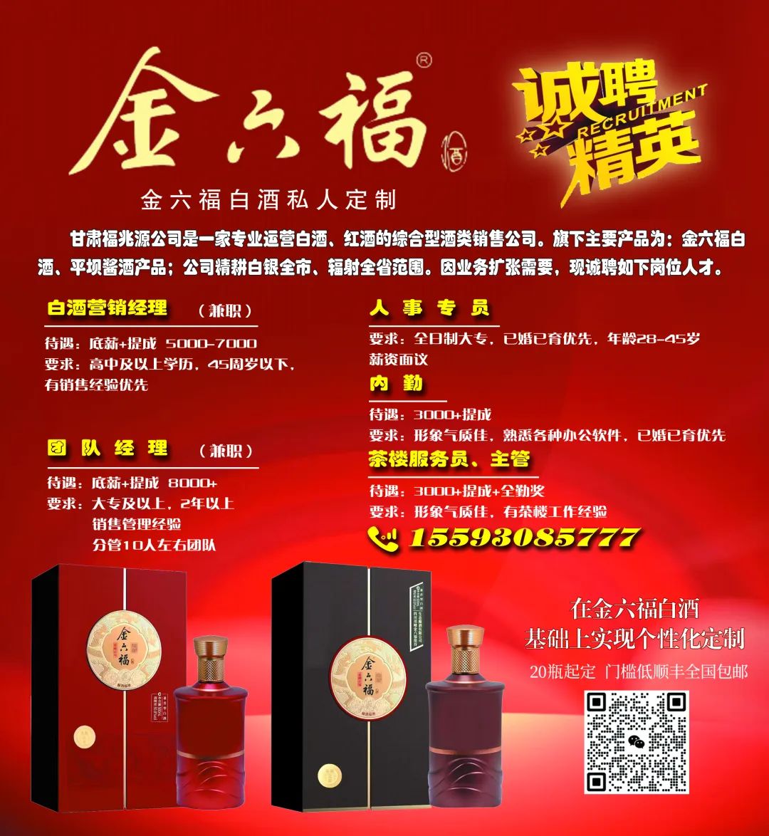 甘肃福兆源公司是一家专业运营白酒、红酒的综合型酒类销售公司。旗下主要产品为:金六福白酒、平坝酱酒产品;公司精耕白银全市、辐射全省范围。因业务扩张需要,现诚聘如下岗位人才。