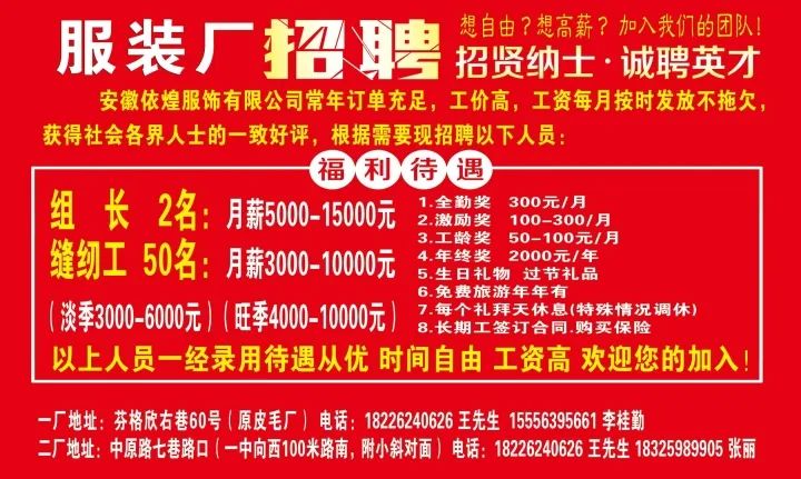工资+满勤奖金+年终奖,要长期工,短期的勿扰,