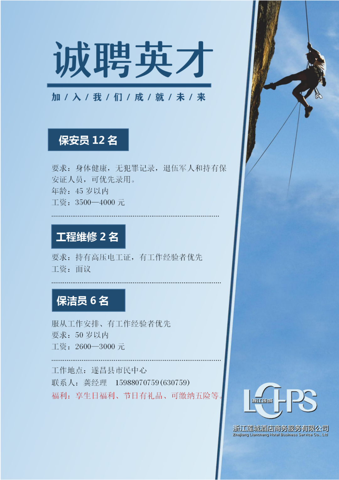 缴纳五险!招聘 保安12名!保洁员6名!维修工2名!