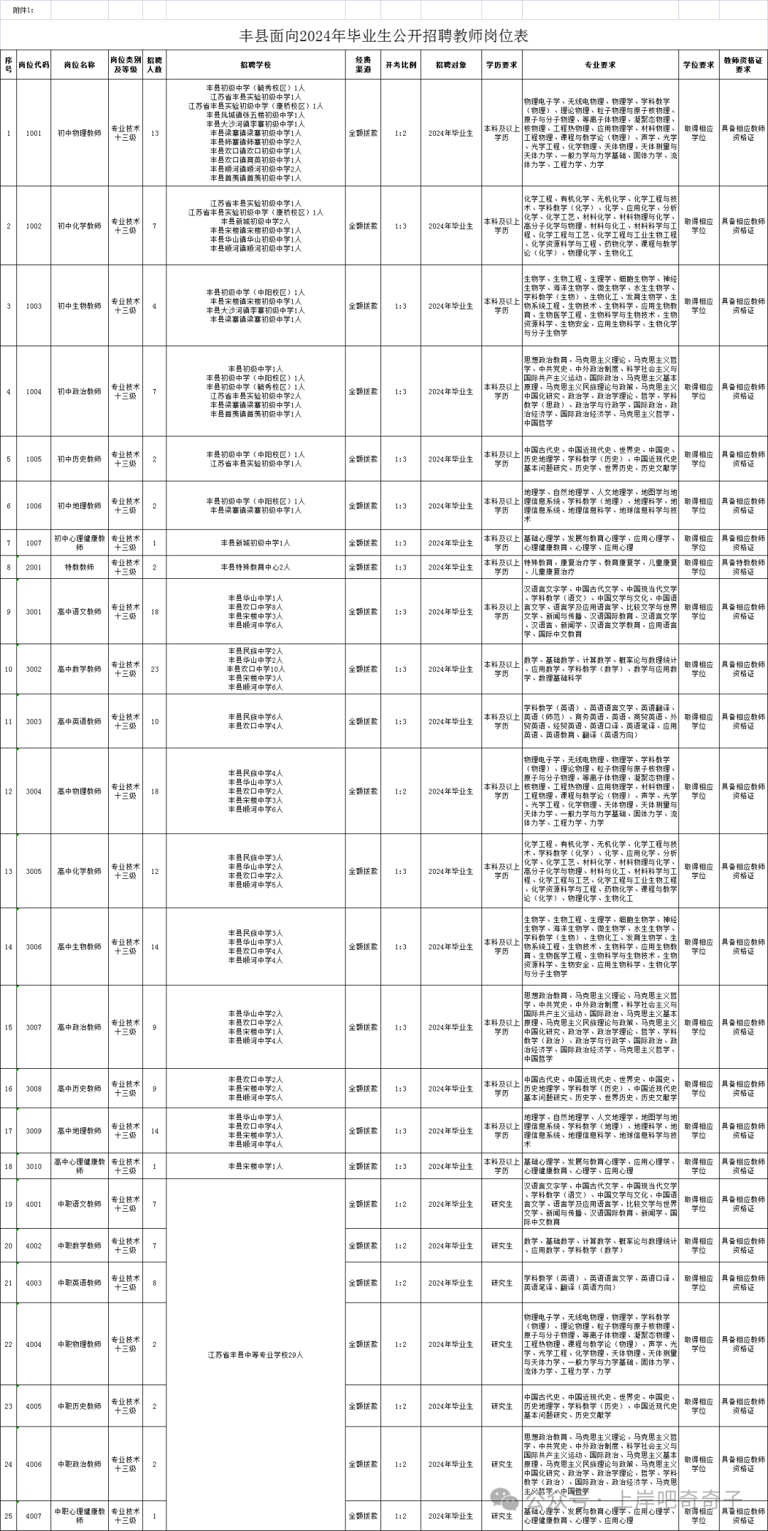 (四)学历学位条件:各岗位学历学位条件详见《丰县面向2024年毕业生公开招聘教师岗位表》(以下简称《岗位表》)。
