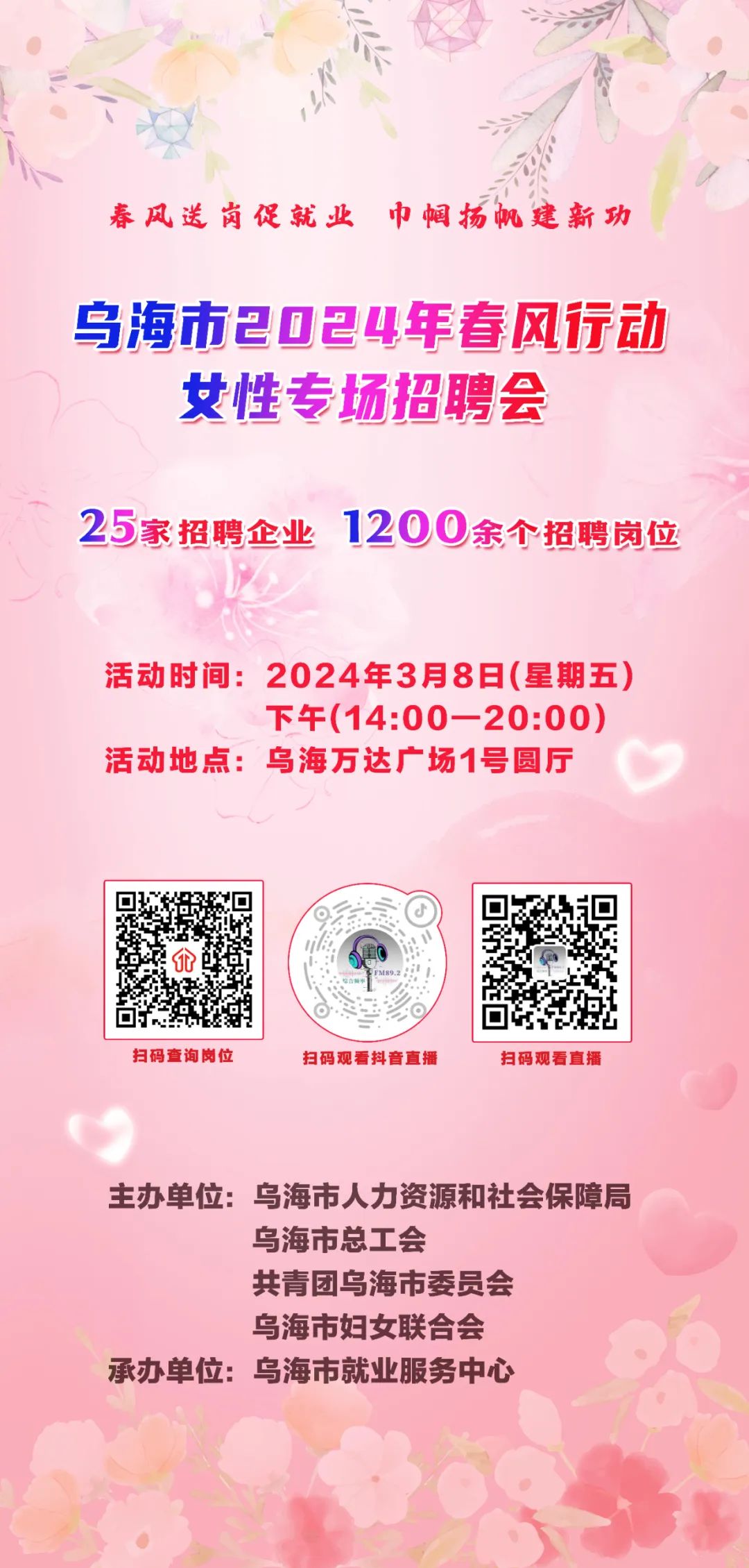 为全面贯彻党的二十大精神,认真落实稳就业保就业决策部署,精准搭建用人单位与女性劳动者之间供需对接平台,市人社局、市总工会、团市委、市妇联共同举办乌海市2024年春风行动女性专场招聘会,诚邀各类用工单位及女性劳动者、高校毕业生等重点群体参与招聘活动。