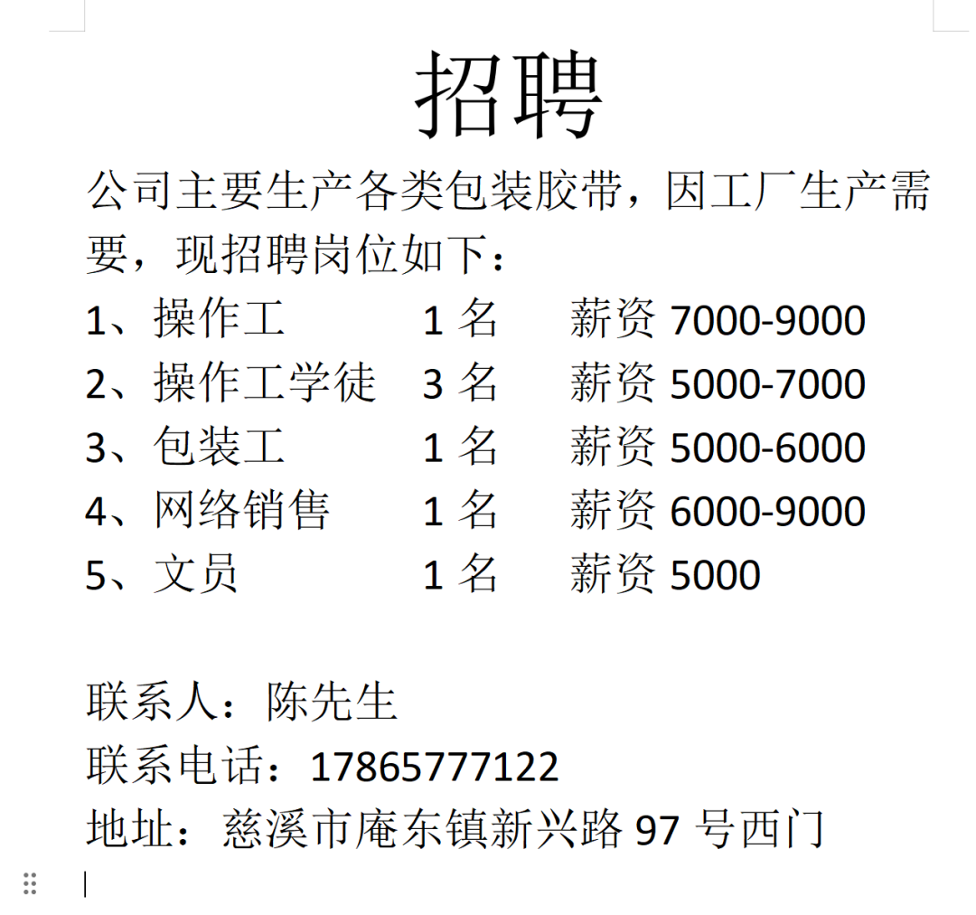 ▼现招聘:1、胶带分切师傅或者学徒3名,薪资5000-9000,具有经验长期稳定者优先。2、电商客服1名,具有一定工作经验,薪资面谈。