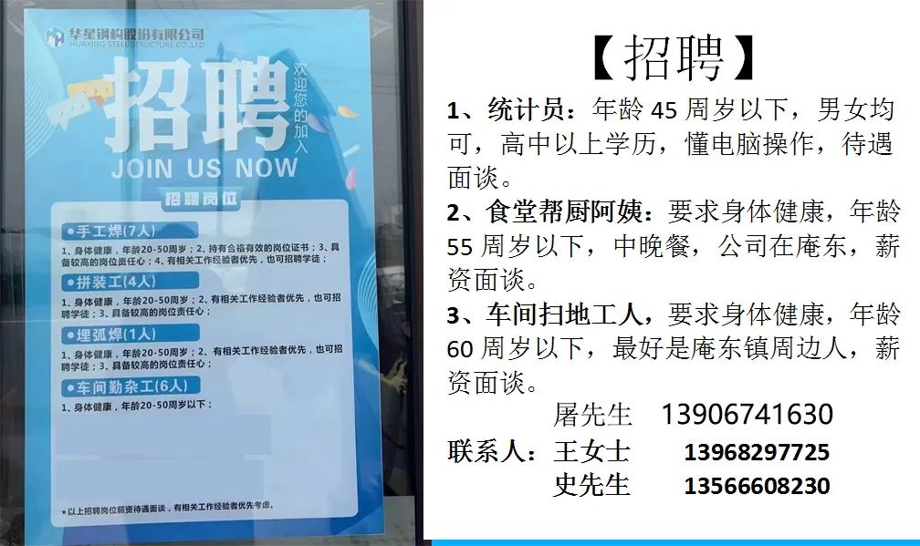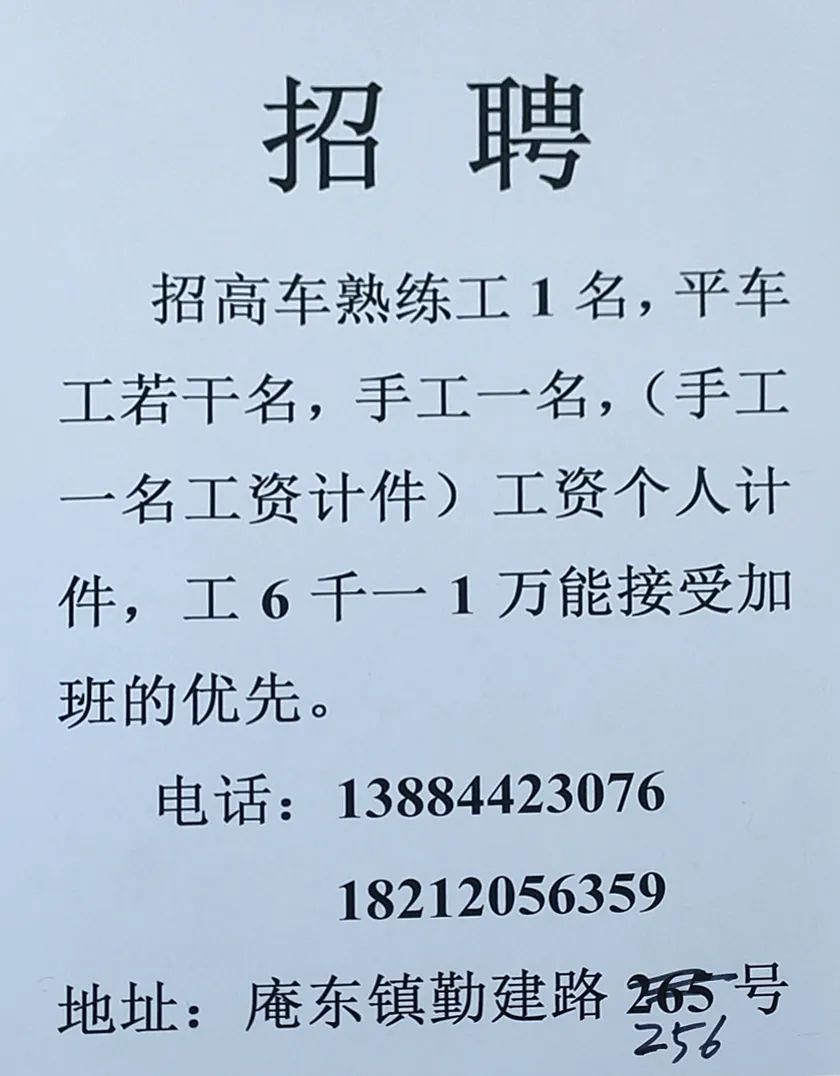 ▼招男工,年龄40-60,产品计件,月薪5000-7000元,,有无工作经验不重要,厂里有师傅会教。另招勤杂工,月薪4000。联系人:姚女士15968478303,庵东纬二路历崔线十字路口东(龙强床上用品院内)