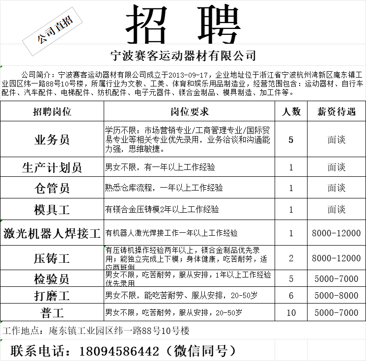 ▼本公司招聘:丝印操作工3名,年龄18到40周岁,男女不限,到手工资每月6500到7500,装配工3名,女,到手工资每月6000到6500,模切操作工2名,男,每月到手工资6300到7000,岗位工资,绩效工资,餐食补助,节日福利,全勤奖,车间都配有空调,工作环境干净整洁,联系电话:18058281199,13585197355 工作地点:庵东镇江南村