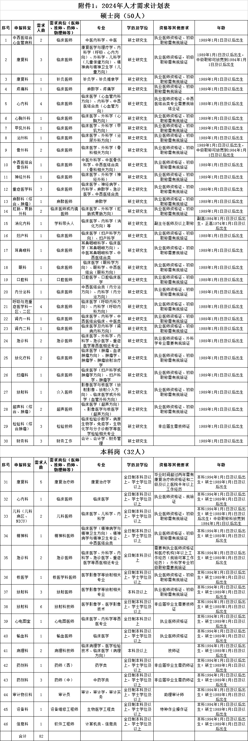 1、岗位条件:招聘科室、专业、人数等见附件1《2024年人才需求计划表》。