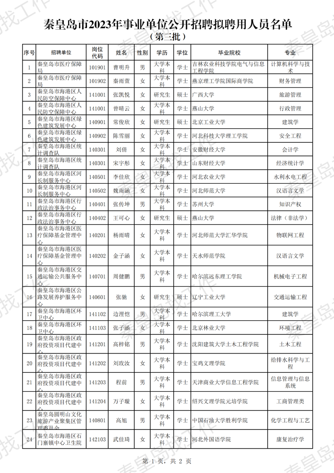 附件:秦皇岛市2023年事业单位公开招聘拟聘用人员名单(第三批)