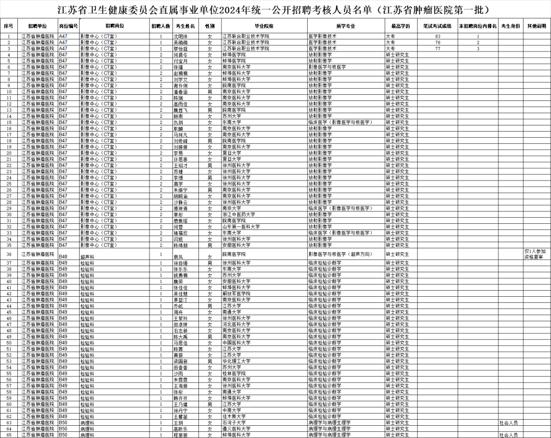 我院2024年公开招聘工作人员计划已于2023年12月20日在江苏省人力资源和社会保障厅网站对外公布,根据《江苏省卫生健康委员会直属事业单位2024年公开招聘工作人员公告》要求,我院已确定部分岗位参加考核人员的名单(附件),部分考生已明确放弃或未通过资格复审的,不在名单中。现将有关考核工作公告如下:2.实践能力考核(专业实践能力考核、综合实践能力考核)A47岗位考核形式为实践能力考核,考核内容为综合实践能力考核。总成绩为笔试成绩(30%)+实践能力考核成绩(70%)。B47、B48、B49、B50岗位考核形式为实践能力考核。考核内容为专业实践能力考核和综合实践能力考核,总成绩为100分,专业实践能力考核和综合实践能力考核各占50%。考核地点:江苏省肿瘤医院(本部),具体考核地点以具体通知为准,务必保持手机通畅。报到迟到10分钟视为取消资格,请考生提前规划好时间和路线。③报考“2024年毕业生”岗位的考生须携带毕业生就业推荐表、就业协议书及成绩单原件;2022、2023年毕业生及其余应聘人员须携带报名所需学历、学位证书原件。2.若资格复审时应聘者提供的信息与报名信息不一致或不符合卫生行业资格准入的,取消应聘者考核资格。3.考生进入考生准备室至考核结束,应将所有通讯工具关闭后放入专用信封,并将其交由考务工作人员统一管理。考生应严格遵守考场纪律,遵守考核程序,自觉接受工作人员的指导和管理。按照《江苏省卫生健康委员会直属事业单位2024年公开招聘工作人员公告》要求,根据总成绩按招聘岗位拟招聘人数1:1的比例从高分到低分确定参加体检人选,如总成绩相同,岗位一的考生笔试成绩高者体检,岗位二的考生组织加试。根据体检和考察结果,确定拟录用人员名单。因体检、考察不合格等原因出现招聘岗位空缺时,在考核合格人员中一次性递补人员参加体检。