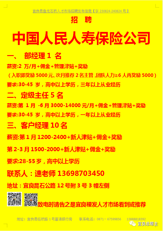 信息发布咨询地址:宜良稷发人才市场一楼大厅
