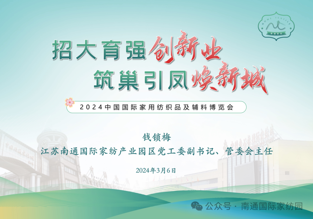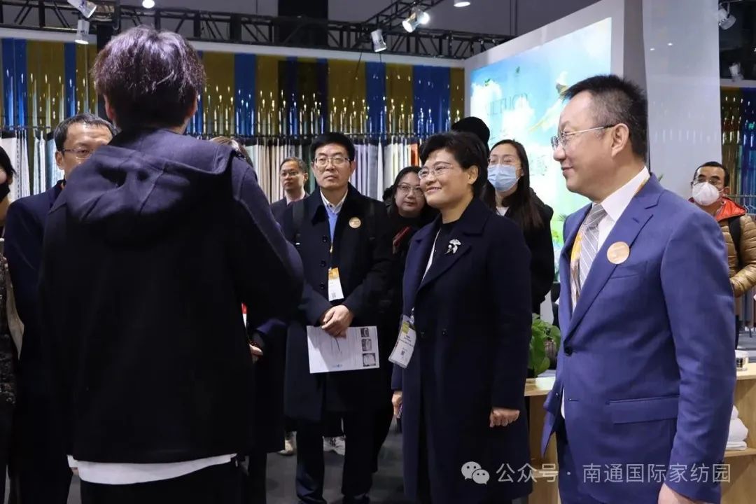 2024年3月6日上午,在上海国家会展中心举办的2024中国国际上海家用纺织品及辅料(春夏)博览会开展,南通家纺14家企业组团参加。国家工信部消费品司一级巡视员曹学军,中国纺织工业联合会领导李陵申、杨兆华、阎岩、梁鹏程,中国家用纺织品行业协会会长朱晓红等领导嘉宾一行走访了南通床品产业链,了解企业发展情况、体验创新产品,并出席张謇杯·2023中国国际家用纺织品产品设计大赛颁奖典礼暨南通国际家纺产业园区推介会活动。园区党工委副书记、管委会主任钱锁梅陪同。