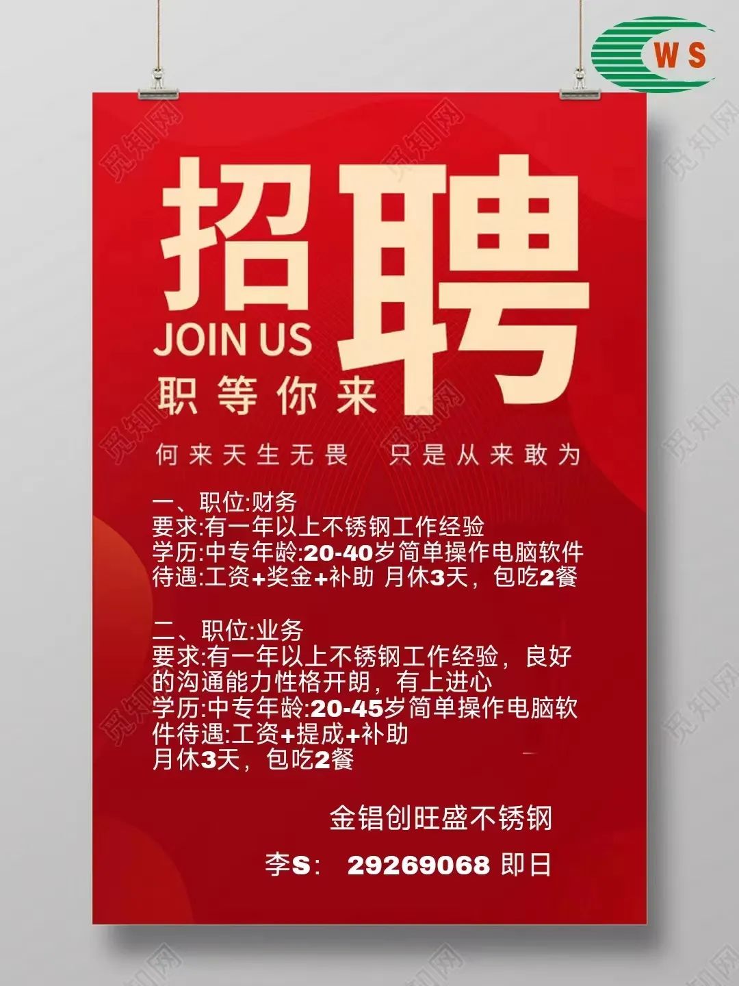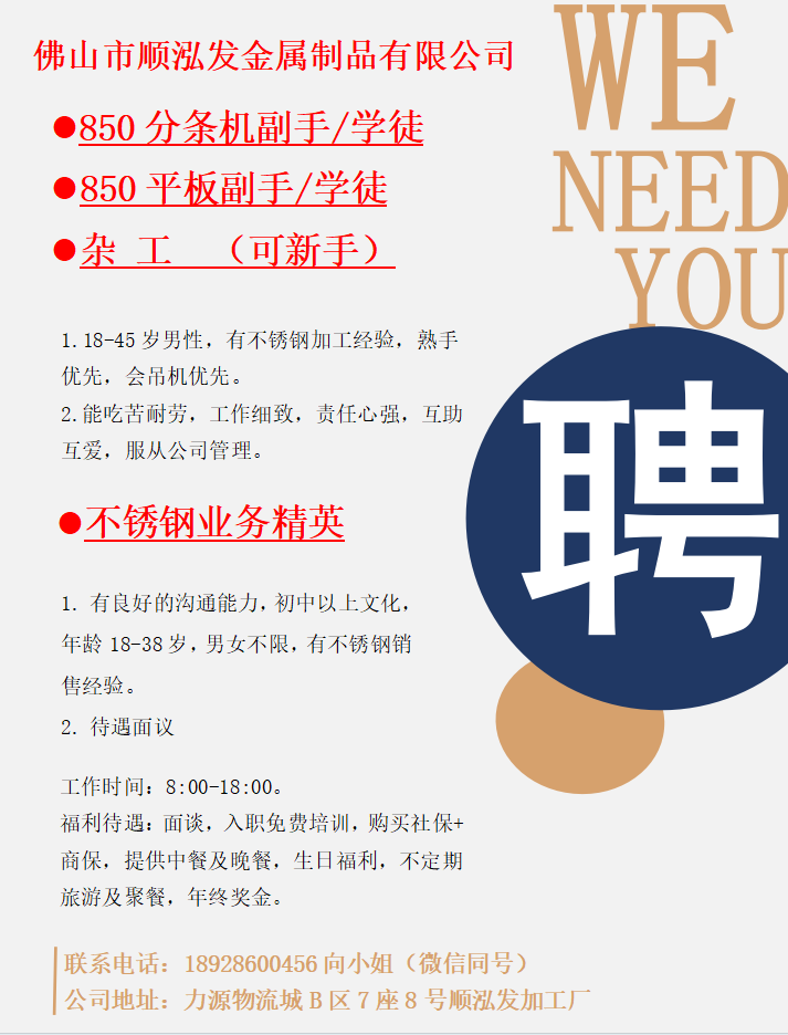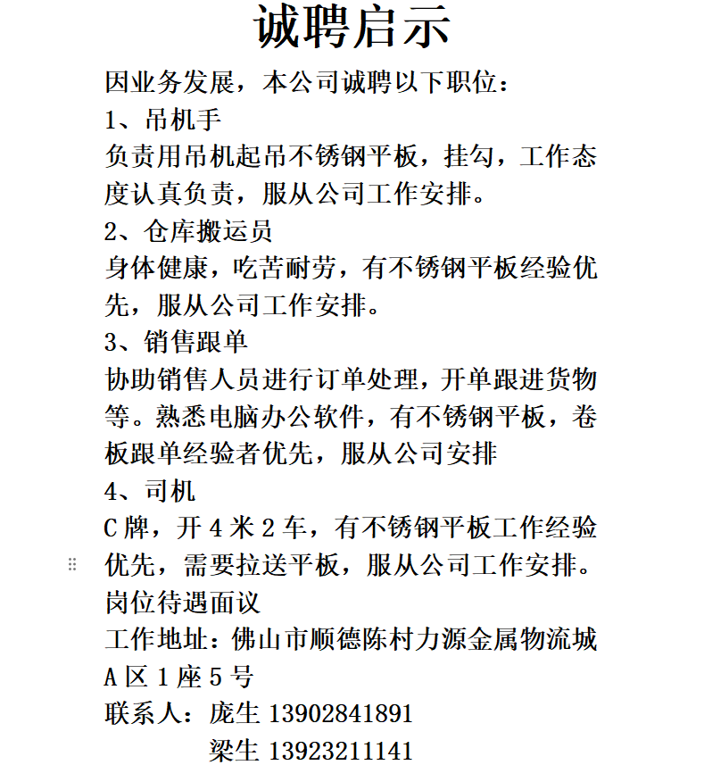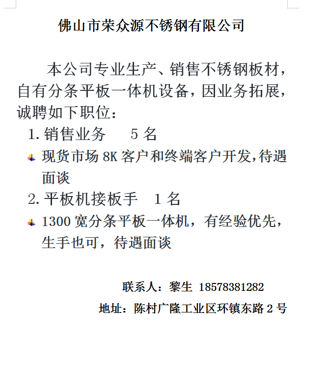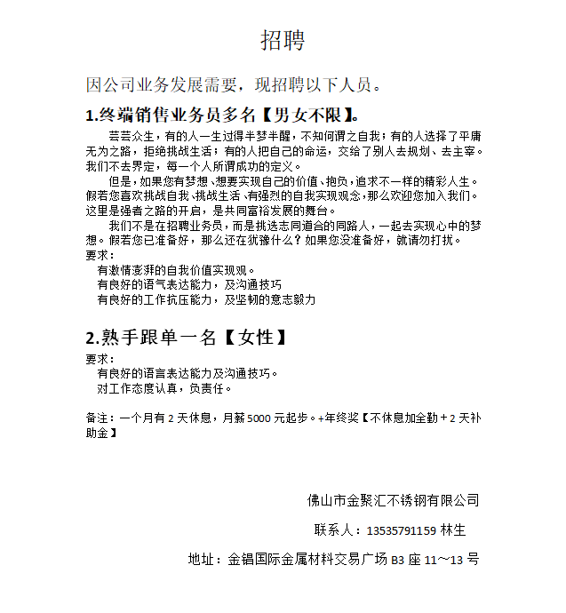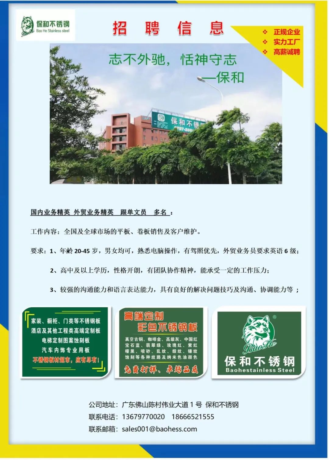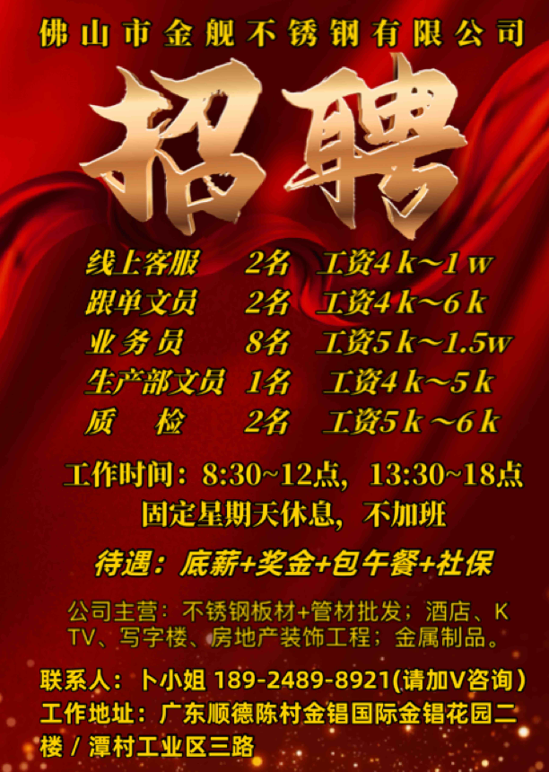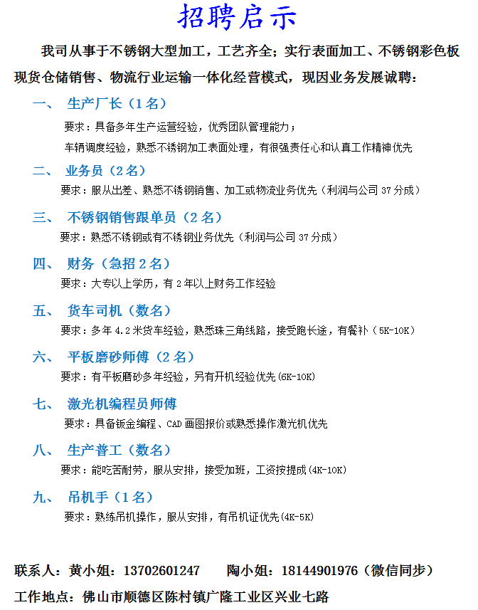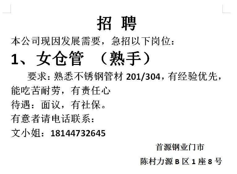 熟悉使用办公电脑,有不锈钢行业工作经验或仓库管理经验优先考虑