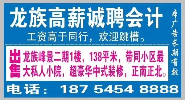 3、【招聘】爱宝堡孕婴童生活馆诚聘如下岗位 卖场:收银6名【2200-3000】,母婴顾问10名【2200-5000】, 游泳馆:泳疗师8名【2200-4000】,抚触师6名【2200-3500】, 产后恢复:前台6名【2200-4000】,技师10名【2500-10000】; 红黄蓝亲子园:亲子老师10名【2000-10000】,亲子顾问4名【2000-5000】。 以上人员一经录用:底薪+缴纳保险+满勤奖+带薪休班+提成【上不封顶】+旅游奖励 报名咨询电话:13723979005【微信】王 4、安信地板现 <诚聘>店长,导购,市场销售人员数名。要求:表达能力强,善于沟通,有亲和力。年龄20-35岁之间,略懂设计优先,电话13705456181一经录用,待遇优厚。地址:五洲国际商贸城40B 5、招贤纳士:龙口恒运汽车销售有限公司诚聘汽车销售经理一名,销售精英若干名,要求语言表达干练,善于沟通,有上进心,无不良嗜好。年龄三十5⃣️岁以下,男女不限。有从业经验的优先录取,月薪加提成(业绩和公司比例分成)每月过万都不是问题!公司地址,龙口市西城区牟黄公路高速路口西188米,恒通汽贸展厅,招聘热线,刘景诗 15726386888,13665452555 6、【招聘】晨晖汽车东、西城区两店诚聘汽车销售顾问10名,月薪5000-8000,有无经验均可,联系人:杨经理 13589858488,另聘汽车美容装潢技工一名,学徒工一名,待遇优厚。 7、【招聘】红木家居馆,诚聘优秀导购5名,18一35周岁,每天工作9小时,月休息3天,底薪3000,加提成,管中午餐。联系电话:13454900555。 吉楼出租:龙族峰景4楼86方,两室两厅,一厨一卫,家电齐全,拎包入住。电子监控猫眼,免费无线,有意者可加微信或电话联系私聊13455507800 15063891979微信同号 吉楼租售:位于发达桥北遇家龙丰小区,四楼,133平方,带空调和部分家具,集体供暖。小区环境优美,邻近市场、学校,生活便利,可租可售。联系电话13863856565 吉楼出售:西城区康泰路梁家矿家属区,一楼85平方,附带宽大前院及平房,院里可种花草蔬菜。靠近临街,位置佳,看房议价。联系电话:13589808052 卖床:因工作调动,刚买的三张鑫虎床低价转卖,全新高箱床体+冬夏两套床垫+两个床头柜,原价3200元,1999元就卖。联系电话:1358980805