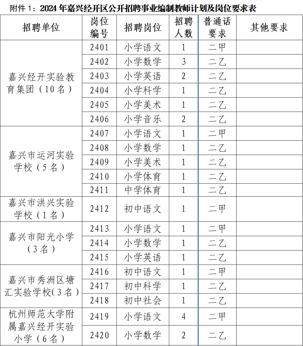 附件:1.2024年嘉兴经开区公开招聘事业编制教师计划及岗位要求表