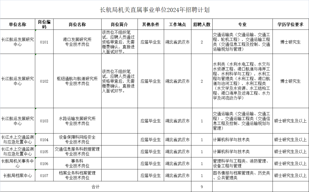 本次招聘的岗位为长航局机关直属事业单位工作岗位,共招聘9人。现将本次招聘公告如下: