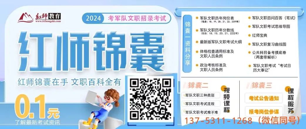 点击“阅读原文”进入红师微信官网,免费学习“2024军队文职课程、信息及政策”!
