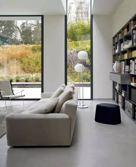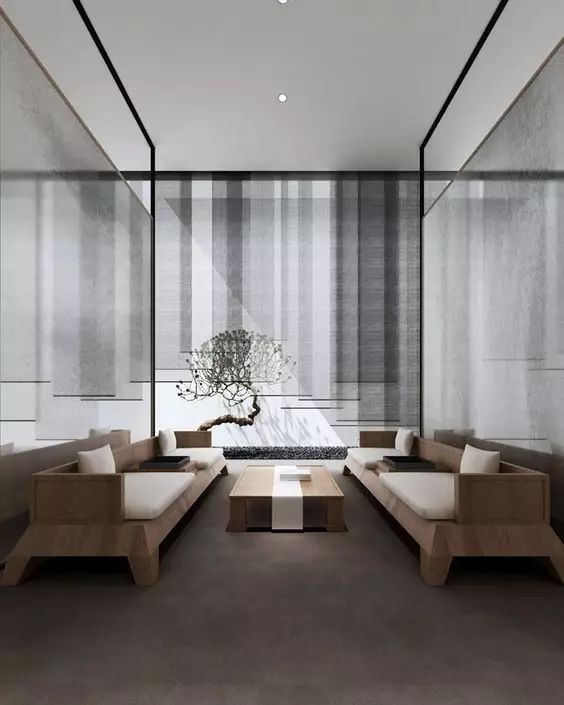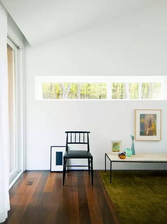 这是现代室内框景常用的设计手法,直线的现代窗格,将自然的灵性纳入生活空间,连通室内室外。既是一种建筑的表现手法,也蕴含了诗人的动人情致。