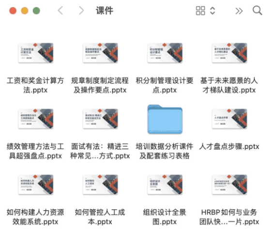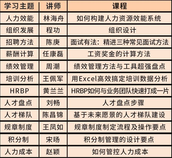 内容覆盖招聘面试、薪酬福利、绩效管理、员工培训、企业文化、员工关系、人资规划、组织发展、胜任力、人才盘点、人才梯队、任职资格、员工晋升、规章制度.员工手册、定岗定编、岗位管理、人效分析18大模块工作。