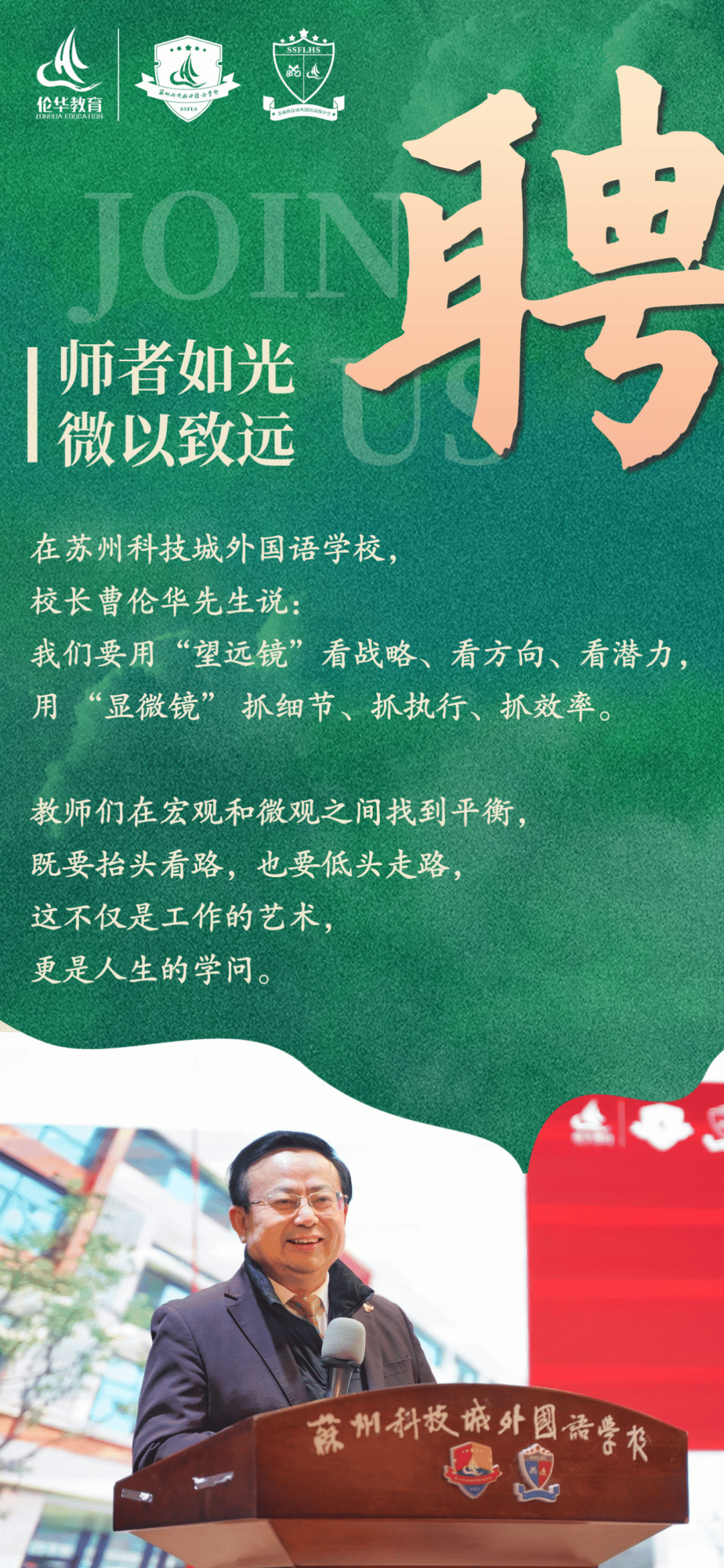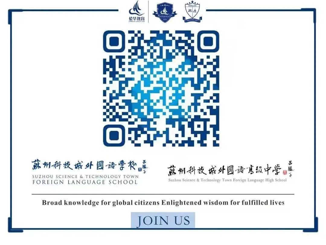 关注“苏州科技城外国语学校”微信公众号,在公众号右下方点击“Join us”填写资料;您也可以直接扫描下方二维码填写资料。