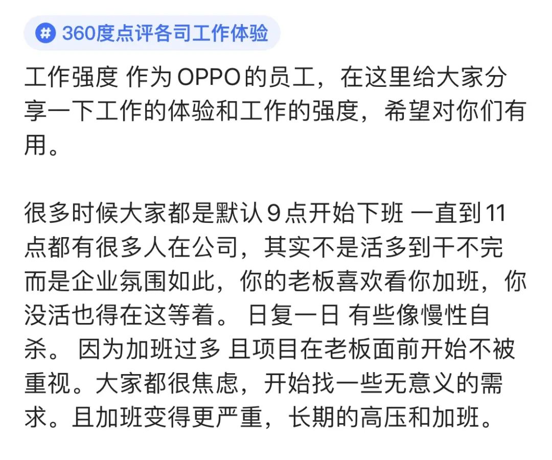 有网友在OPPO吐槽加班的问题,好多人晚上下班了还在公司,并不是工作任务繁重,而是企业氛围导致的。加班跟不加班对公司的产值影响没那么大,只是行业都如此,你很另类,貌似就说不过去。