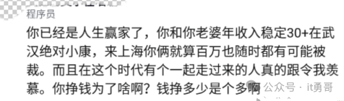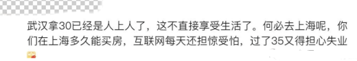 稳定的30万收入,跟百万的收入比起来,差异是很大的,但在武汉这个待遇确实还不错。有网友说在上海肯定是会被裁,其实也是相对而言的,并不是年龄干大了一定会被裁,具体要看自己能力怎么样,没那么绝对,主要是看个人的想法,