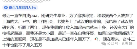 现在考事业编的人很多,一定要知道事业编的待遇不那么高,如果在意薪酬,一定要慎重。有个网友,跟自己的老婆,放弃了上海大厂+中厂的工作机会,回到了武汉发展,现在两人加在一起的年薪是30多万,现在开始后悔了。如果当时选择了上海的互联网,现在收入可以达到百万级别,现在感觉落差很大,奋斗20年也达不到月入5万。