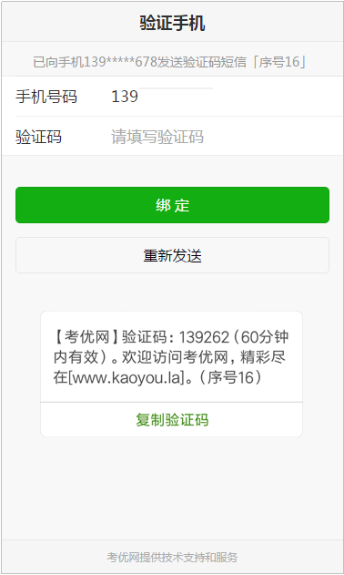为便于联系考生,考试前需验证考生联系电话的有效性,系统向考生手机发送随机验证码短信,考生填写验证码,完成验证。
