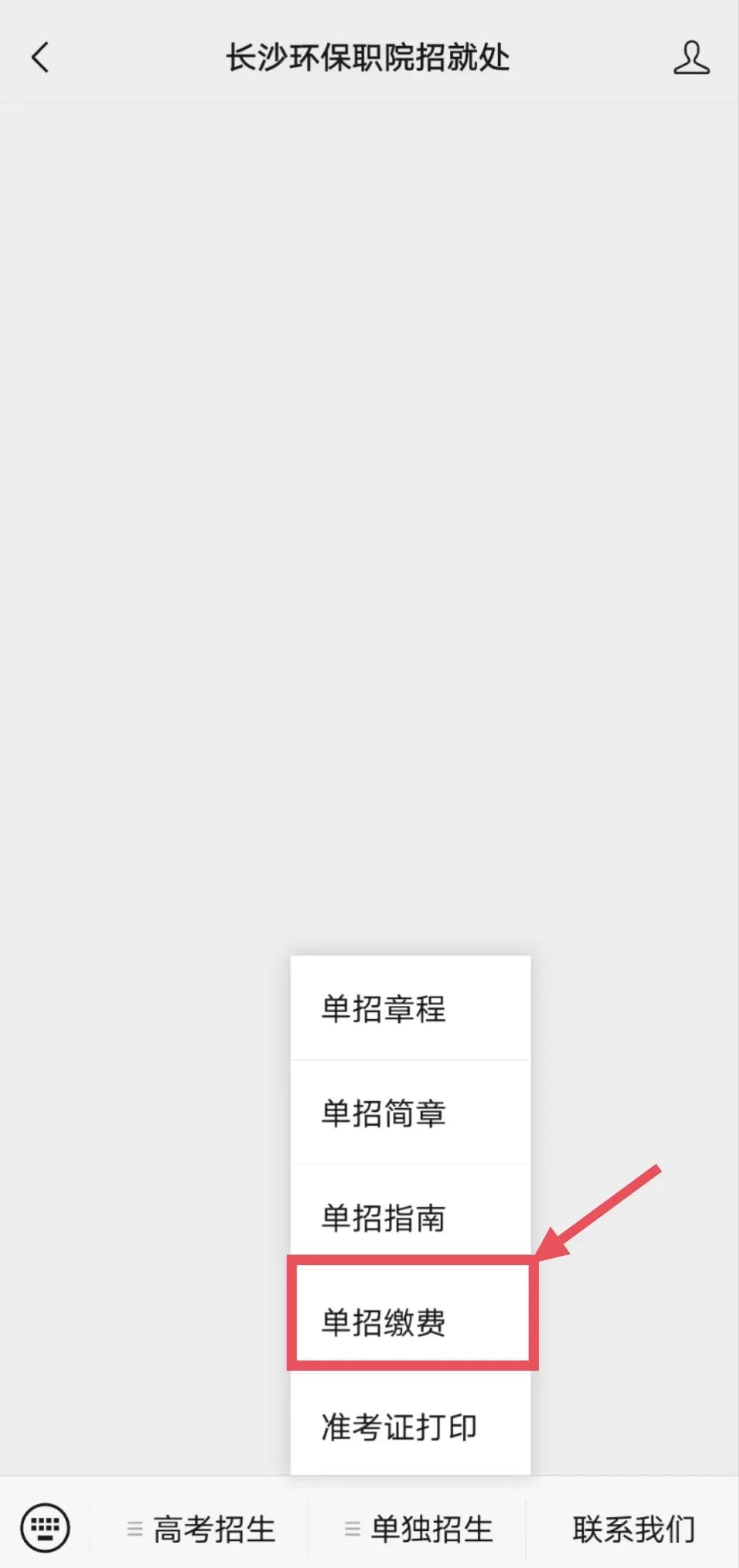 扫描左侧二维码,关注“长沙环保职院招就处”,点击下方菜单栏“单招缴费”进入系统。