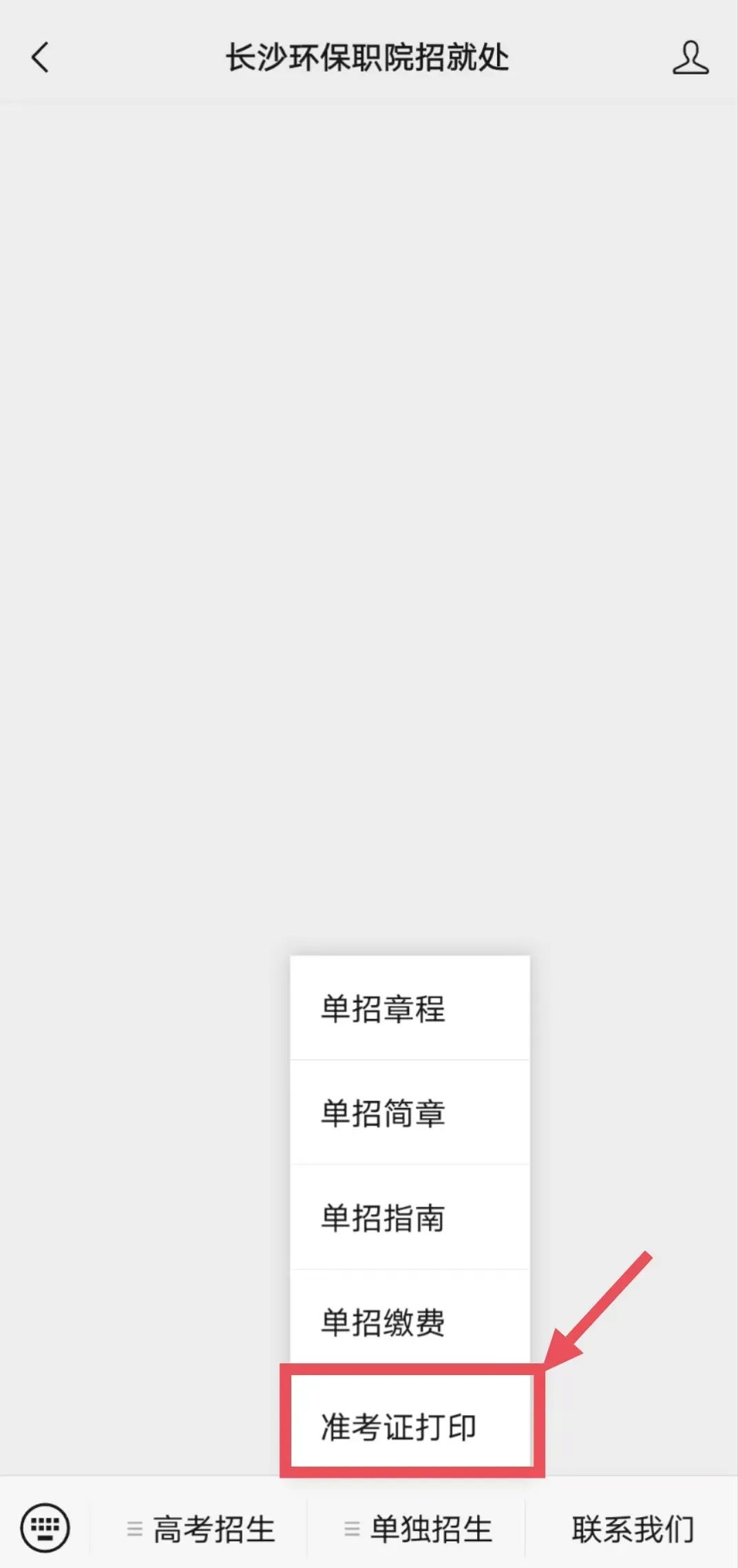 关注微信公众号“长沙环保职院招就处”,点击下方菜单栏“准考证打印”。