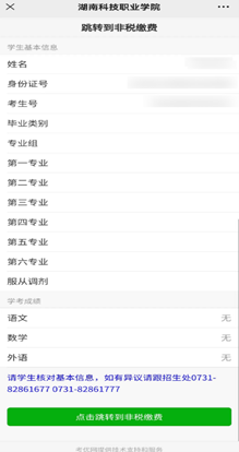 考生信息验证完成后,请核对基本信息跳转到非税缴费,如有异义请与招就处联系:0731-82861677。
