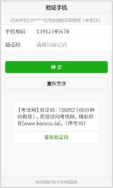 为便于联系考生,缴费前需验证考生联系电话的有效性。系统向考生手机发送随机验证码短信,考生收到验证码短信后,填写收到的验证码完成验证。