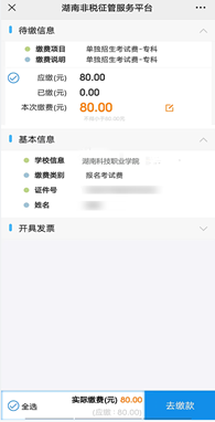 根据上级收费文件规定,单招考试缴纳考试费80元/人,缴费时间为3月8日14:00—3月9日24:00。缴费后方可打印准考证,准考证打印时间为3月14日至15日,缴费方式为微信支付,关注微信公众号“湖南科技职业学院”。