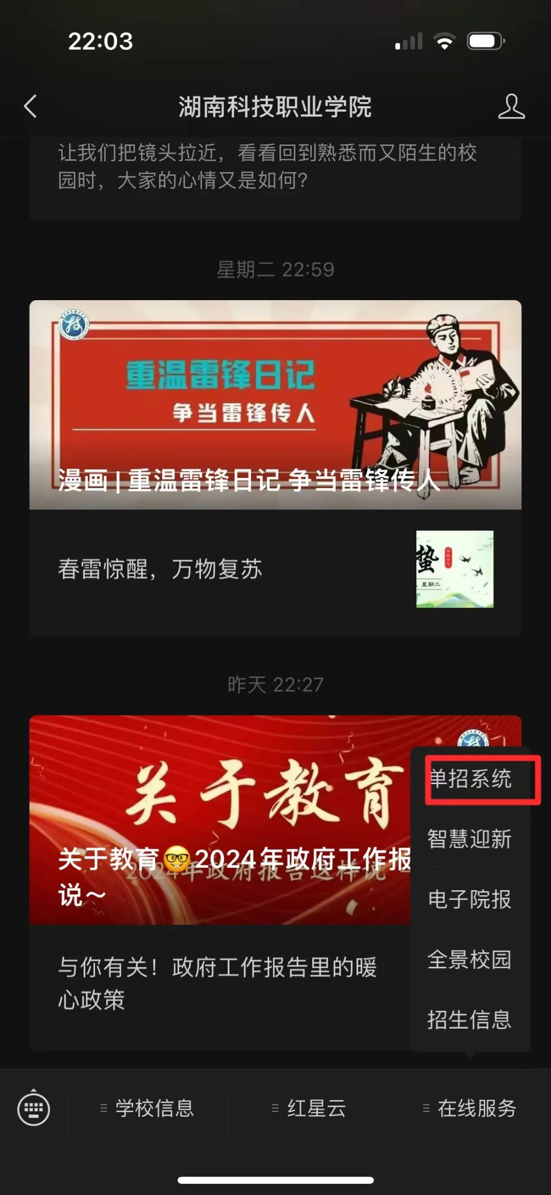 通过公众号菜单“在线服务----单招缴费”进入报名缴费系统。缴费系统3月8日下午2点后正式开放。