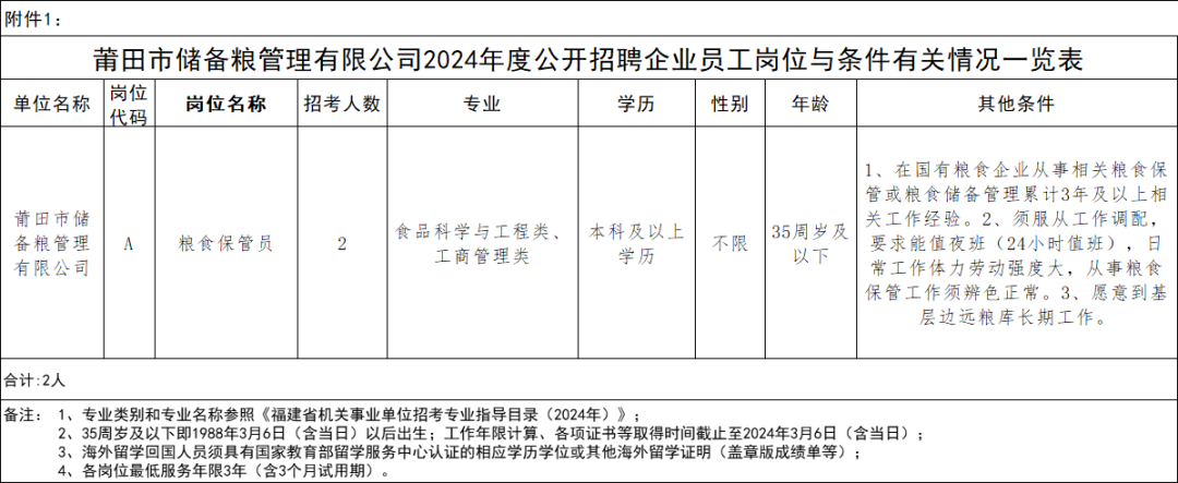 *本文包含广告信息 莆田储备粮管理有限公司招聘 因工作需要,莆田市储备粮管理有限公司面向社会公开招聘企业员工。现将有关事项公告如下: 招聘岗位: 本次公开招聘人数2名