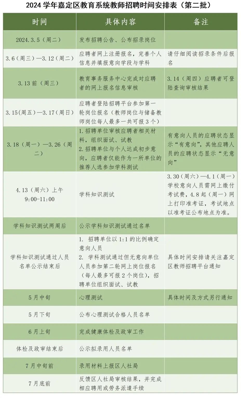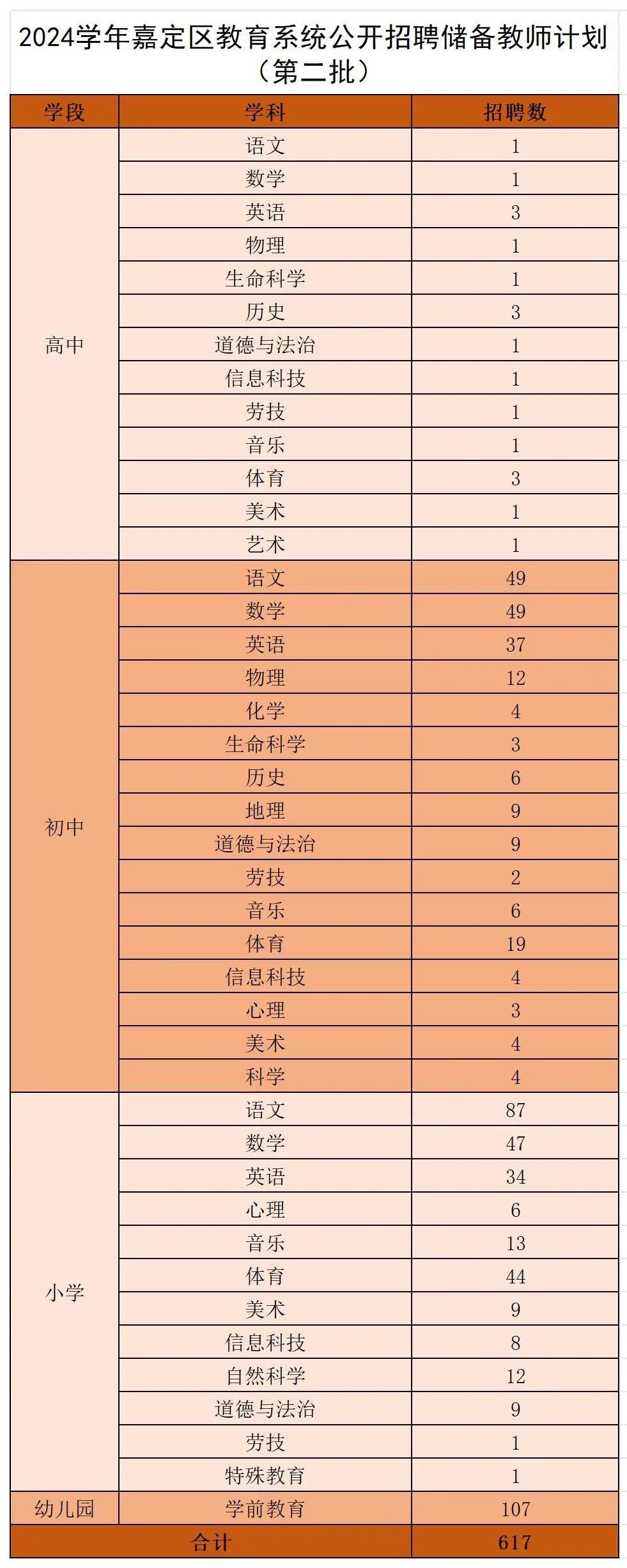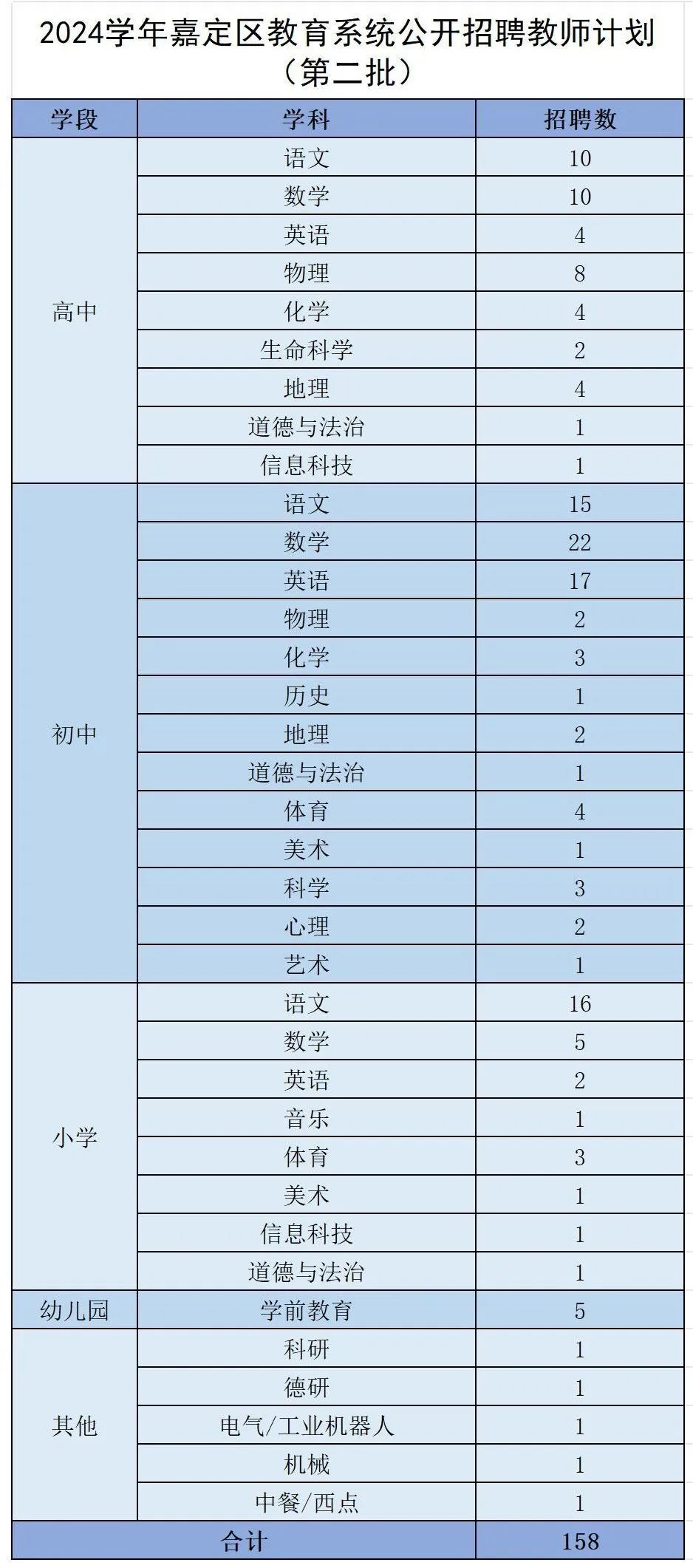 详见《2024学年嘉定区教育系统公开招聘教师计划(第二批)》(附件1)及《2024学年嘉定区教育系统公开招聘储备教师计划(第二批)》(附件2)。