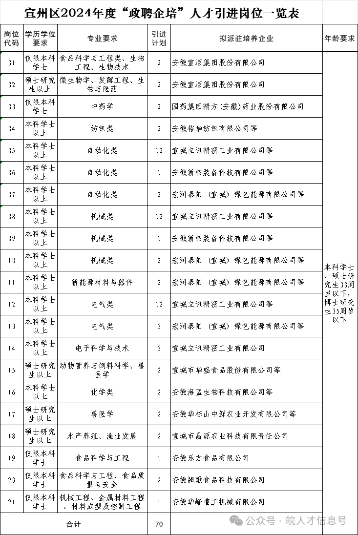 为深入贯彻执行《宣城市“十四五”人才发展规划》,积极推进“政聘企培”人才引进新模式,集聚一批科技创新人才,助力宣州区产业发展。依据《宣州区人才储备“政聘企培”实施办法》,决定开展2024年度宣州区“政聘企培”人才引进工作,现将有关事项公告如下: 一、引进原则 引进工作坚持德才兼备、以德为先的用人标准,按照“公开、平等、竞争、择优”的原则,实行岗位公开、自愿报名、择优选拔的用人机制。 二、引进岗位和计划 2024年度宣州区公开引进70名“政聘企培”人才,详见《2024年度宣州区“政聘企培”人才引进岗位一览表》(见附件)。 三、引进对象和条件 引进对象为“双一流”建设高校本科学士以上学历学位或普通高校硕士研究生以上学历学位的应届毕业生(含符合国家规定择业期内的2022年、2023年高校毕业生),且必须符合下列条件: (一)具有中华人民共和国国籍; (二)遵守宪法和法律; (三)具有良好的品行; (四)岗位所需的专业条件; (五)适应岗位要求的身体条件; (六)岗位所需的其他条件(详见附件:《2024年度宣州区“政聘企培”人才引进岗位一览表》)。 公开招聘人员岗位表中的“30周岁以下”为“1993年3月(含)以后出生”(其他涉及年龄计算的依此类推)。 有下列情形之一的人员,不予引进: (一)不符合引进岗位条件要求的人员; (二)经政府人力资源社会保障部门认定具有考试违纪行为且在停考期内的人员; (三)曾因犯罪受过刑事处罚的人员和曾被开除公职的人员、受到党纪政纪处分期限未满或者正在接受纪律审查的人员、处于刑事处罚期间或者正在接受司法调查尚未做出结论的人员; (四)法律规定不得参加报考或聘用为事业单位工作人员的其他情形人员。 四、引进程序和方法 引进工作按照发布引进信息、报名与资格审查、笔试、资格复审、专业测试、体检与考察、公示、审批、签订劳动合同等程序进行。 (一)发布引进信息 本次引进公告在宣州区人民政府网招考专题发布。后续有关环节信息通过宣州区人民政府网招考专题发布。 (二)报名与资格审查 本次报名采取网上报名的方式进行。报名时间为2024年3月13日8:00至3月31日17:00,逾期不再报名。 1.网上报名。报考人员登录人事考试网上服务平台(https://www.exapt.cn/)进行报名,并签订《诚信承诺书》。 2.资格审查。网上资格审查工作由宣州区委人才工作领导小组办公室组织实施。报考人员报名后至2024年4月1日17:00前登录人事考试网上服务平台查询是否通过报考资格初审。 3.考试缴费。通过资格审查的报考人员,应于4月3日23:00前登录人事考试网上服务平台进行笔试缴费。依据安徽省物价局、安徽省财政厅皖价费〔2009〕118号文件规定,按笔试费45元/人的标准缴费(逾期未缴费的视为自行放弃)。 4.开考比例。确认报考人数与招考录用计划数的比例达不到2:1的,取消或相应核减录用计划数。被取消招聘岗位的报考人员在4月7日17:00前可改报其他符合条件的岗位。 (三)笔试 1.笔试内容为《综合知识》,满分为100分。 2.笔试时间为2024年4月13日,考点设在宣城市区(详见准考证)。 3.本次考试不指定考试辅导用书,不设定考试大纲,宣州区不举办也不委托任何机构举办考试培训班。 4.笔试成绩将于笔试后一周内在宣州区人民政府网招考专题公布,考生可自行访问查询。 (四)资格复审 按照应聘人员笔试成绩从高分到低分顺序,根据招聘岗位计划数,按3:1的比例确定各岗位参加专业测试的人员,最后一名如有数名考生笔试成绩相同的,一并确定为参加专业测试人选。若少于或等于该引进岗位计划数时,直接确定为专业测试人选。资格复审材料包括: (1)有效居民身份证原件及复印件; (2)已取得毕业证、学位证的需提供毕业证、学位证原件; (3)2024年全日制应届毕业生未取得毕业证、学位证的需提供《毕业生就业推荐表》《学籍在线验证报告》等能证明本人学籍信息的材料,以及“本人关于毕业证书专业与报考专业相一致,已修完全部课程且各科成绩合格,毕业证书、学位证书待发”的书面承诺。 (五)专业测试 1.专业测试时间、地点:详见《专业测试通知书》。 2.专业测试采取结构化面试,主要考察应聘人员的综合素质等。 3.考官组成:考官组一般不少于7人,其中宣州区外考官数量占考官组人数的一半以上。计算成绩时,除掉一个最高分和一个最低分,取其余考官平均分为该考生专业测试成绩。专业测试成绩采取百分制计分,成绩四舍五入,保留两位小数。 4.当参加某一岗位专业测试实到人数少于或等于该引进岗位计划数时,考生专业测试成绩须达到70分或该考场实际参加专业测试人员的平均分,方可进入体检和考察环节。 (六)成绩合成 1.报考人员考试最终成绩依统考笔试成绩与专业测试成绩合成确定后在宣州区人民政府网站上公布。 2.考试最终成绩按统考笔试成绩占50%、专业测试成绩占50%合成确定。成绩合成时,保留到小数点后两位,小数点后第三位四舍五入。 3.根据招聘计划数和应聘人员考试最终成绩,从高分到低分,按1:1比例等额确定体检、考察对象。如最终成绩相同,依次以专业测试成绩、《综合知识》成绩得分高者优先。若考生各科目成绩均相同,则采取加试的方法,加试方案另行公布。递补人员的确定照此规定执行。 (七)体检与考察 1.体检与考察工作由宣州区人社局统一组织实施。 2