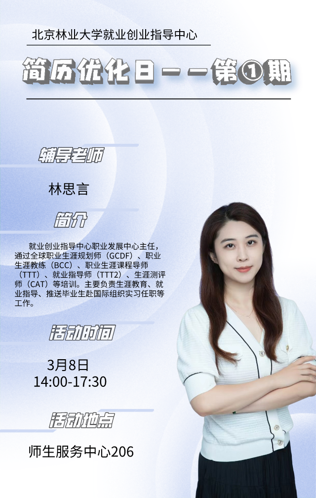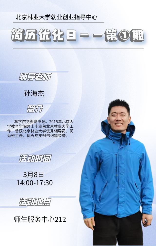 你是否正在为求职路上那份不够完美的简历犯愁? 是否希望有一个机会,让你的简历在众多竞争者中脱颖而出? 学校为了进一步提升我校学生求职能力,企划开展系列“简历优化日”活动! 在这里,我们拥有经验丰富的就业指导老师,他们深知什么样的简历最能吸引雇主的眼球。本次活动中他们会帮助你打磨出一份专业、有吸引力的简历。 ![]() 活动特色 ![]() 专业导师一对一指导 你的简历将得到专业的点评和建议,让你明确如何优化改进。 ![]() 实时反馈 线下活动保质保量,与指导老师一起让你的简历在短时间内得到质的提升。 ![]() 求职技巧分享 除了简历修改,还可以向老师请教求职过程中的各种技巧,让你在面试中更加从容自信。 ![]() ![]() 请有参加活动意愿的同学准备好纸质版个人简历,并于指定时间内前往相应的活动地点,届时将有指导老师对同学们进行一对一的简历优化。 如有疑问或需要更多信息,敬请关注“北林就业”公众号。 北京林业大学就业创业指导中心 排版 | 谢雅婷 责编 | 孙梦茹 执行主编 | 林子琪 主编 | 王晓东 审核 | 穆琳 ![]() |