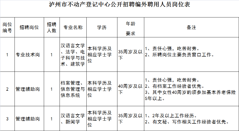 因工作需要,泸州市自然资源和规划局下属事业单位市不动产登记中心拟面向社会公开招聘3名编外聘用人员,现将有关事项公告如下。
